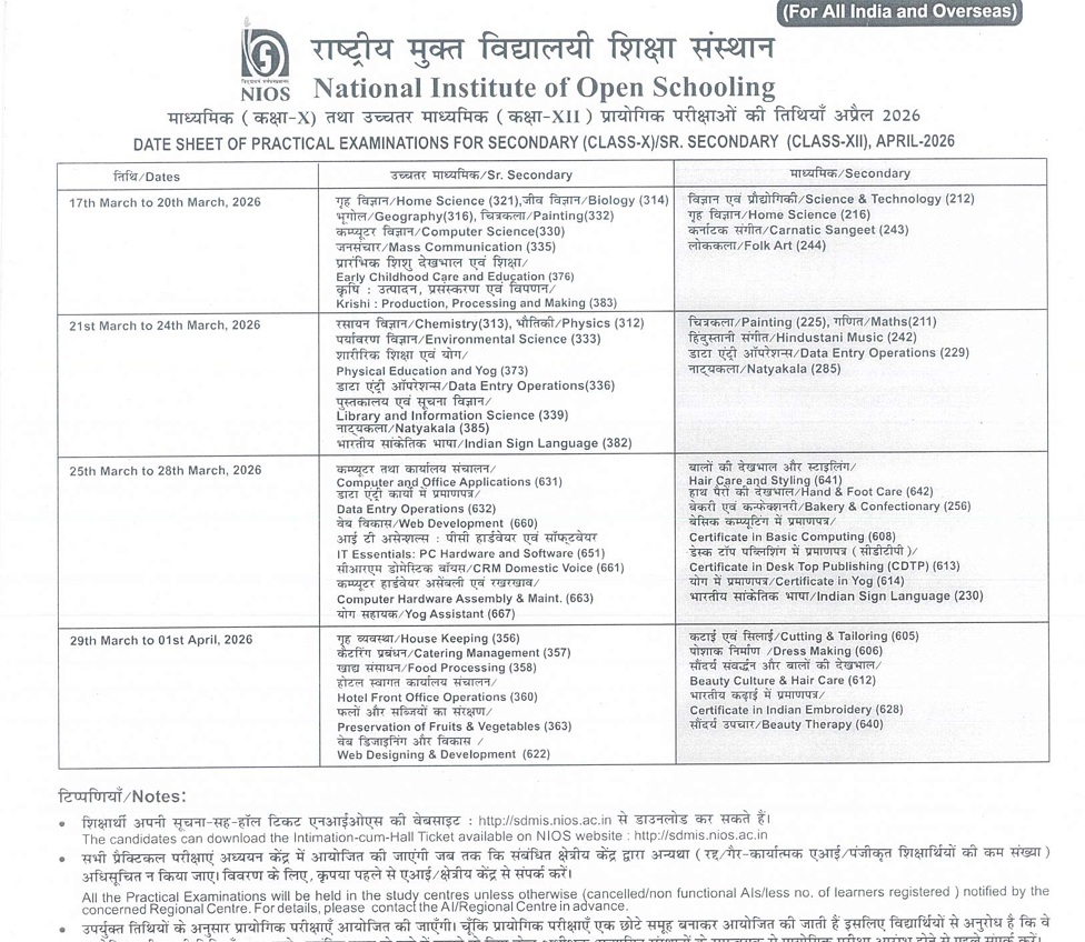 NIOS PRACTICAL Date Sheet-MARCH 2026